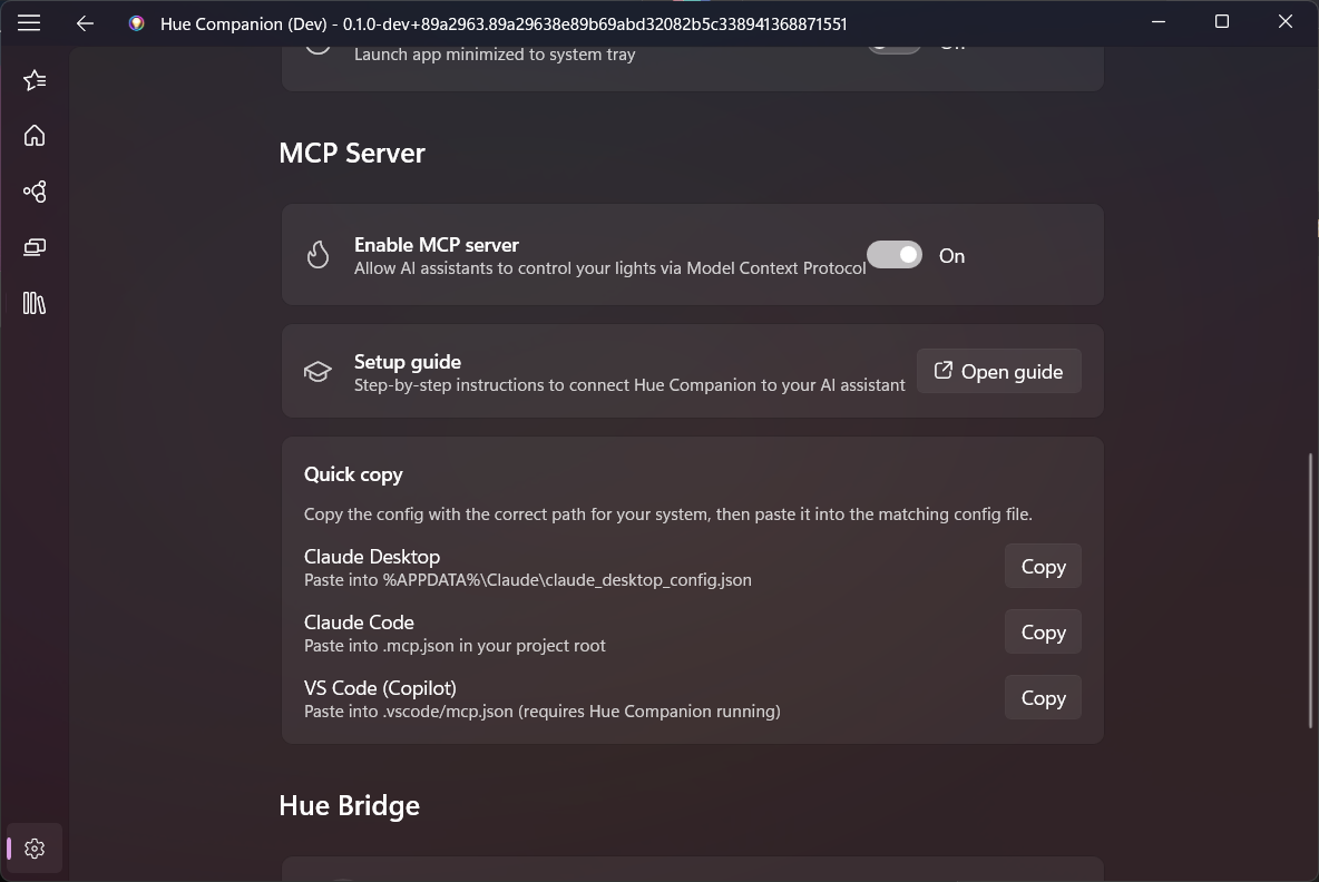 Connect Hue Companion to Claude, VS Code, and other AI assistants via the Model Context Protocol.