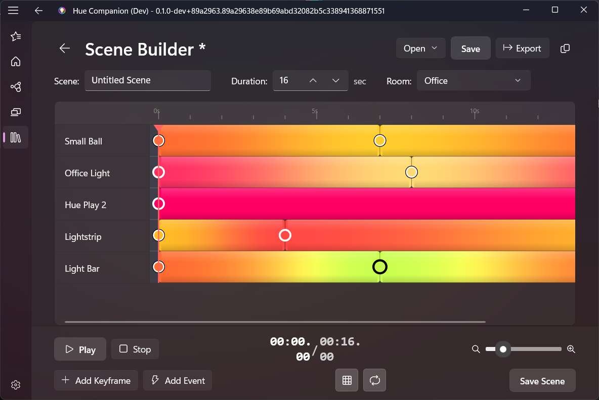 Create timeline-based lighting animations with keyframes, multiple tracks, and event triggers.